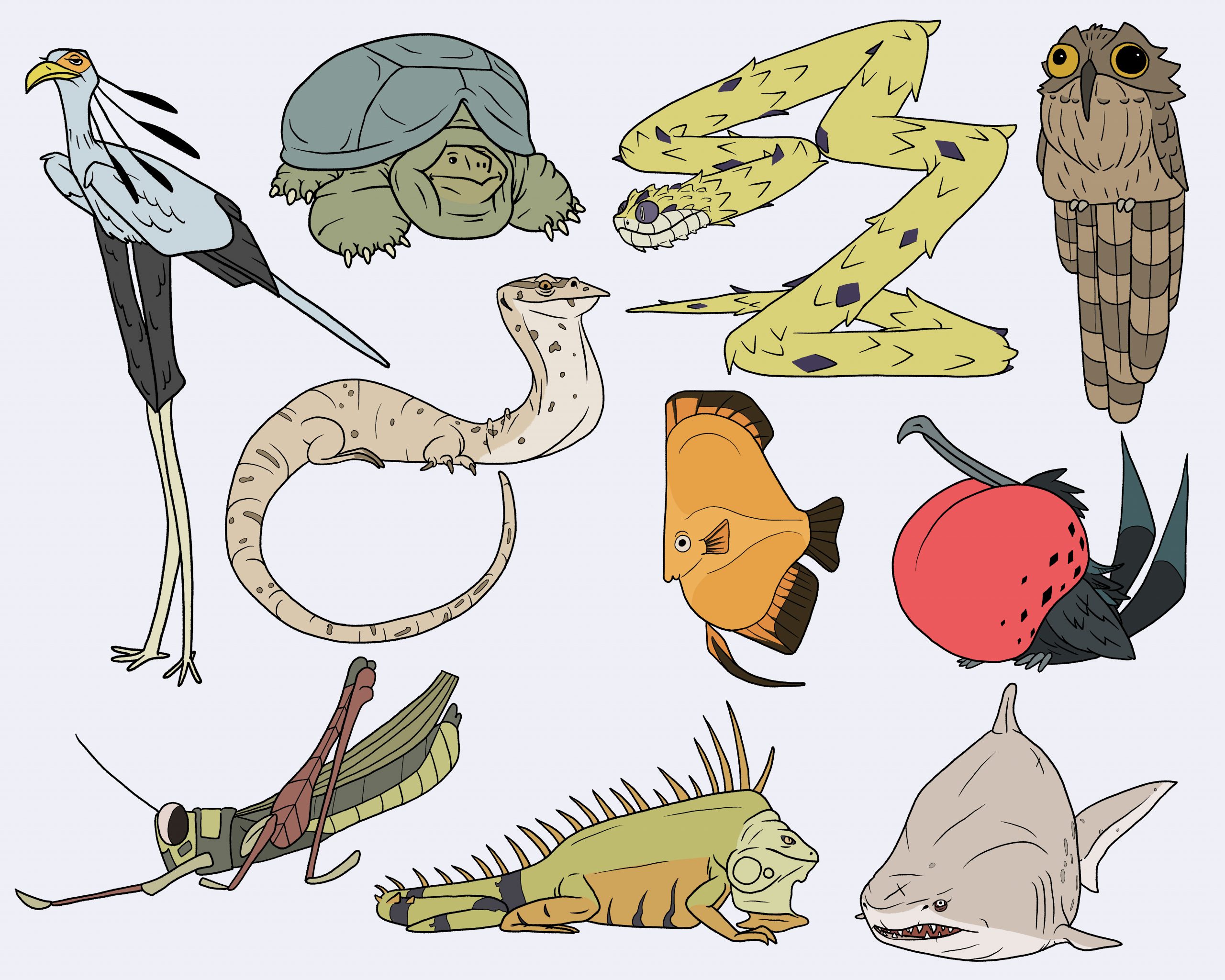 James Cook, 4.29.2025, Photoshop, A page of 10 different colored animals on a blank background